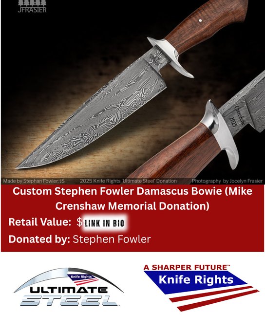@KnifeRights 🔴 Ultimate Steel™ Prize Feature Stephen Fowler 8" Mosaic Damascus Bowie – koa handle, stainless guard. Memorial donation honoring Mike Crenshaw. 🗓 Donate by Aug 31 for DOUBLE entries (Main + Tail End). 📤 Please share to support linktr.ee/KnifeRights//t.co/bnFFFML3cR